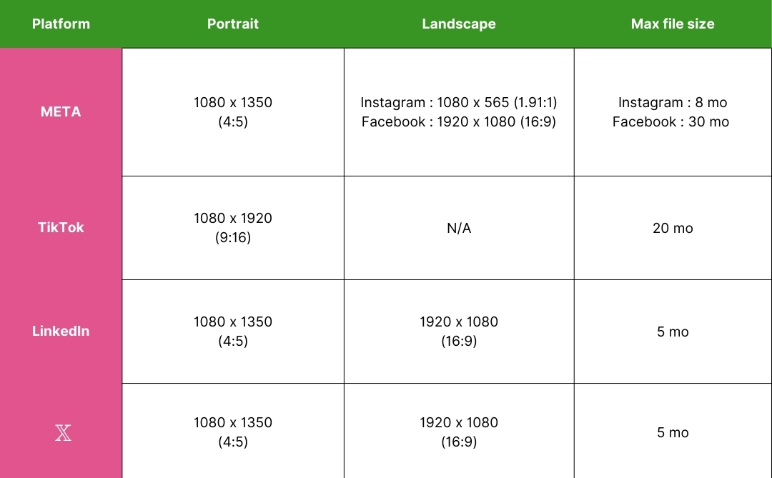To help you navigate the specific requirements of each platform, we have created a detailed table outlining the recommended dimensions for images and videos on META, LinkedIn, and Twitter (X). This visual guide will ensure that your content follows best practices, maximizing its impact and engagement.